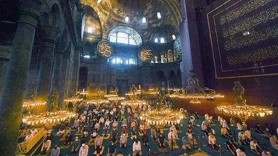 Salat Tarawih yang dilakukan umat Islam setiap malam selama bulan suci Ramadan kembali dilaksanakan untuk pertama kalinya di Masjid Hagia.