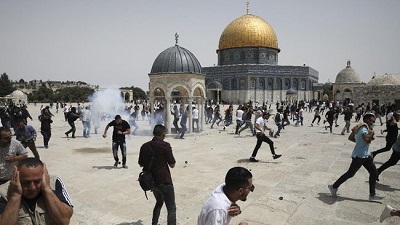 Penduduk Palestina di Yerusalem, Tepi Barat, kembali terlibat bentrokan dengan anggota Kepolisian Israel di Kompleks Masjid.
