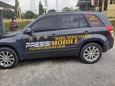 Polres Rokan Hilir gelar vaksin Covid-19 door to door kesejumlah wilayah di Kecamatan Tanah Putih. Mobil gerai vaksin.