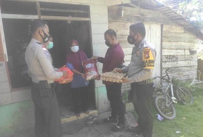 Anggota Polisi di Mapolsek Rangsang Barat, Kabupaten Kepulauan Meranti, punya cara sendiri menunjukkan rasa penduli sosial terhadap warga terdampak.