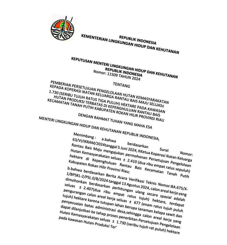 Anggota Kop. IKRAM Rantau Bais pertanyakan terkait Surat Keputusan Menteri Lingkungan Hidup Dan Kehutanan RI Nomor : 11509/2024 tanggal 25 September 2024 tentang Pemberian Persetujuan Pengelolaan Hutan.