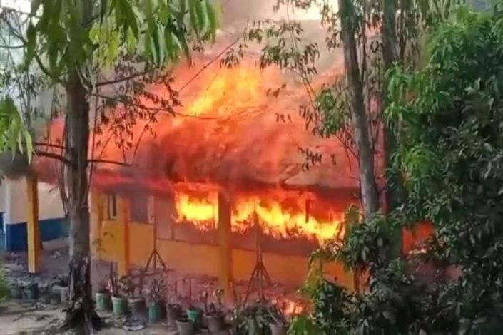 Gedung kesenian SMP Bernas Pangkalan Kerinci di Pangkalan Kerinci hangus, Kabupaten Pelalawan kebakaran..