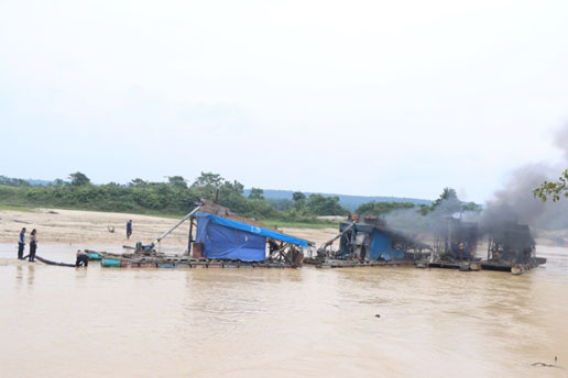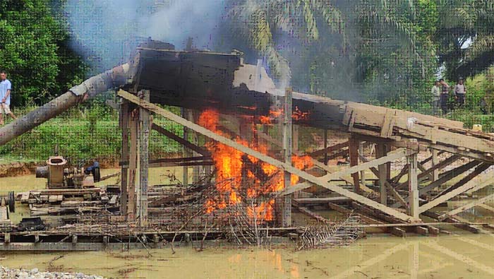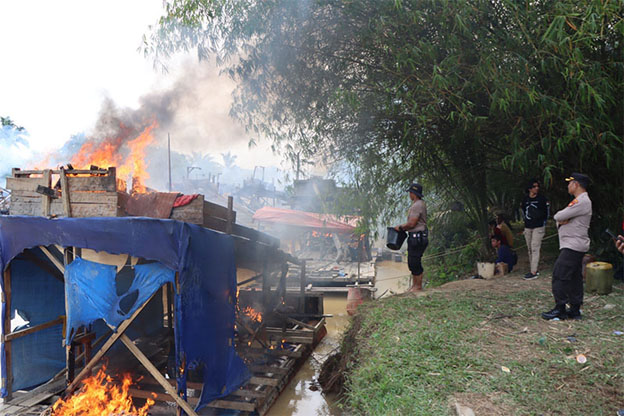 Sebanyak 24 rakit penambangan emas tanpa izin (PETI) di Kabupaten Kuantan Singingi (Kuansing), Riau dimusnahkan polisi, Selasa (11/7/2023).