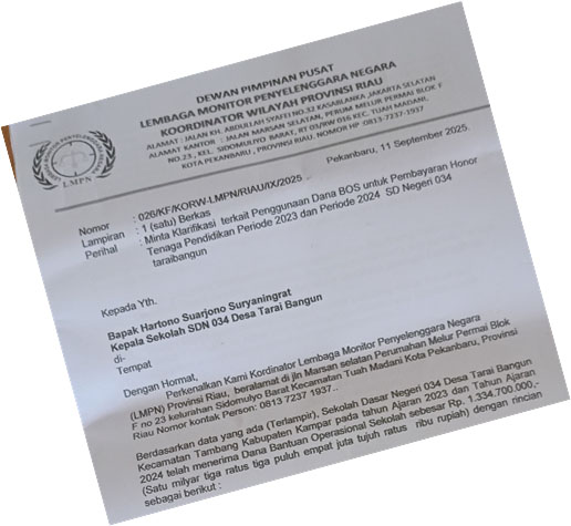 Laporan dugaan penggelembungan dana honor guru di SD Negeri 034 Tarai Bangun, Kecamatan Tambang, Kabupaten Kampar, Provinsi Riau, kini resmi ditindaklanjuti oleh Inspektorat Kabupaten.