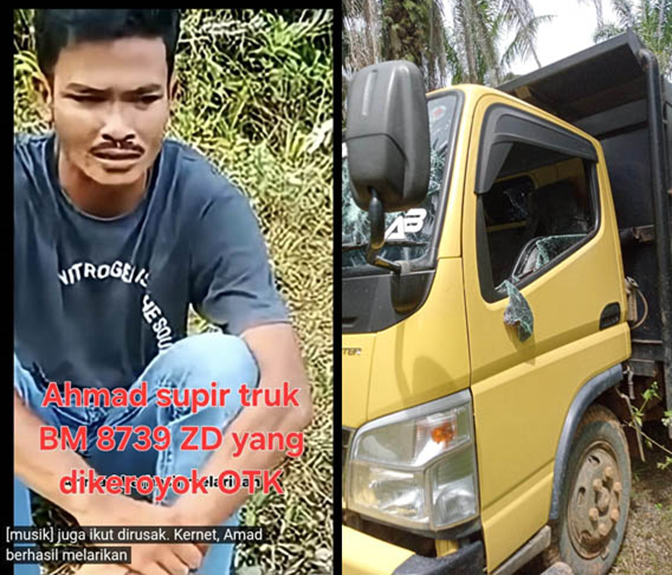 Diperjalanan menuju lokasi Ahmad dihadang puluhan preman menggunakan penutup wajah (sebo) lalu menghajar Ahmad namun sempat melarikan diri truk ditingal, salah seorang bernama Yahya dikenal Ahmad karena pernah melarang masyarakat memanen buah sawit dilokasi kebun masyarakat yang bernaung di Koperasi KOPOSAN. Ahmad sempat melarikan diri meskipun pada bagian pungung sempat kena libas oleh preman dengan menggunakan bambu, truk col diesel yang dikenderai Ahmad rusak parah kaca depan dan kaca pintu samping dirusak, serpihak kaca berserakan dalam kabin mobil, dan satu unit sepeda motor juga ikut dirusak, sampai sejauh ini permasalahan perusakan truk dan sepeda motor tersebut belum ada penjelasan dari pihak Polres Kampar, demikian warga Sinama Nenek menginformasikan peristiwa perusakan truk dan sepeda motor.