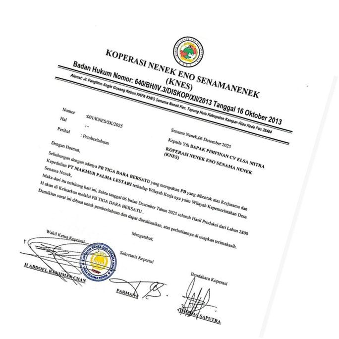 Tak hanya sampai disitu bahwa Kepala Desa Senama Nenek H. Abdoel Rakhman Chan merangkap jabatan sebagai Wakil Ketua Koperasi Nenek Eno Sinama Nenek (KNES) secara terbuka menyurati Pimpinan CV. Elsa Mitra Koperasi melalui surat Nomor : 001/KNES/SK/2025 tanggal 06 Desember 2025 perihal pemberitahuan bahwa terhitung 06 Desember 2025 seluruh hasil produksi dari lahan 2800 hektar akan dikeluarkan melalui PT. Tiga Dara Bersatu yang dibentuk atas kerjasama dan kepedulian PT. Makmur Palma Lestari. tanpa sepengetahuan Kelompok KOPOSAN sebagai pemilik sah kebun sawit seluas ± 1.700 hektar.